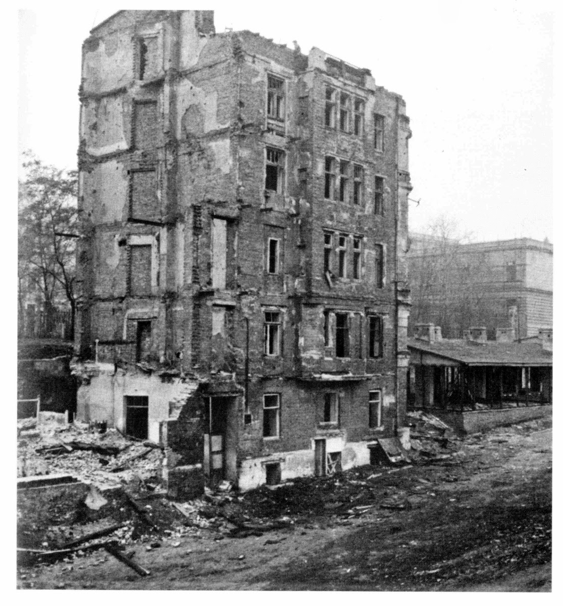 Moim pierwszym, automatycznym skojarzeniem był podobny obrazek z wysadzania kamienicy przy ul. Marszałkowskiej 105: LINK. Nasze zdjęcie wykonano jednak w zupełnie innym miejscu - przypadek ten na tyle mnie zainteresował, że postanowiłem ustalić dokładny adres tej kamienicy. Była ona dość elegancka, miała co najmniej cztery piętra, coś na kształt wykuszu i ozdobny szczyt. Wybite okna w ścianie szczytowej były dość zaskakujące - albo na sąsiedniej posesji była niska zabudowa, albo, co bardziej prawdopodobne, była ona niezabudowana i nie planowano tu żadnej zabudowy. Zastanawiające było również to, że zdjęcie wykonano trochę jakby "pod górę" i z pewnej wysokości. Na pierwszym planie widzimy tylko koronę drzewa, a zatem fotografii nie wykonano z poziomu gruntu.